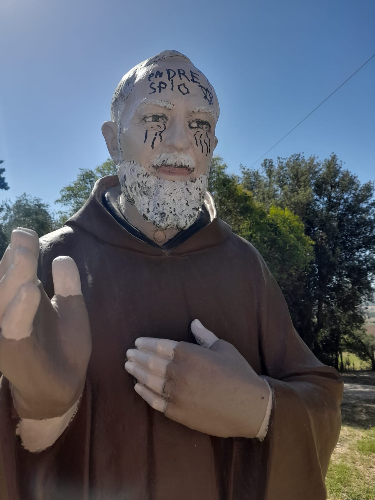 Con un pennarello nero hanno scritto sulla fronte del Santo “Padre Spio” con tanto di stella a sei punte, tradizionale simbolo ebraico. Il colore nero sottolinea anche la barba e gli occhi da cui scendono delle lacrime. I vandali, molto probabilmente, hanno agito mercoledì scorso e dopo l’amara scoperta Don Ignazio si è subito rivolto ai Carabinieri per sporgere denuncia.