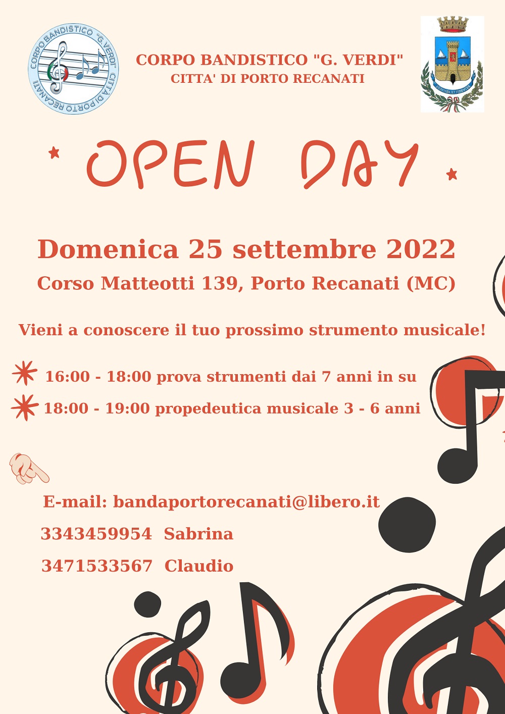 Anche quest’anno il Corpo Bandistico “G. Verdi” Città di Porto Recanati promuove, in collaborazione con il Comune di Porto Recanati e con la Regione Marche, il Corso di Orientamento Musicale di tipi bandistico, aperto a bambini, ragazzi e adulti che vogliono avvicinarsi al mondo della musica.