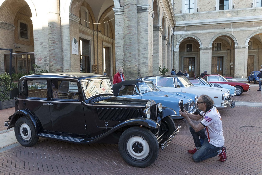 La successiva meta di Montefano ai confini della provincia maceratese è stata raggiunta passando ad Agugliano e Polverigi. La sosta pranzo nella suggestiva location di Palazzo Carradori ha visto il saluto del sindaco Angela Barbieri, orgogliosa di ospitare gli equipaggi offrire le visite del piccolo centro con le sue peculiarità. Al Museo Ghergo si è potuto toccare visivamente il mondo e la tecnica del fotografo Arturo Ghergo, che a cavallo del secondo conflitto mondiale, dopo essere partito dal suo piccolo paese di provincia verso Roma, è stato capace di raggiungere notorietà internazionale come fotografo ritrattista dei divi dello spettacolo e di innumerevoli personalità. Il piccolo e delizioso teatro-bomboniera La Rondinella di origini fine ‘700 e riprogettato in stile liberty a fine ‘800. Per chiudere le visite a Montefano, si sono aperte le porte delle cantine dell’Azienda Agraria degli Azzoni per conoscere i dettagli sulle tecniche di raccolta e lavorazione delle uve, questo grazie alla disponibilità del titolare Filippo Degli Azzoni. Il rientro in Hotel è stato preludio della serata di gala contrassegnata da un godibile accompagnamento musicale e da un ormai tradizionale appuntamento, giunto alla sua 11^ edizione, relativo alla consegna del Memorial Gianmario Lazzarini, fondamentale socio co-fondatore del club CAEM nel 1976. Il riconoscimento, consegnato dal figlio Carlo Lazzarini vicepresidente del club ad Aldo Mosca, concittadino e amico di Lazzarini e socio sempre presente alle iniziative del Circolo maceratese.