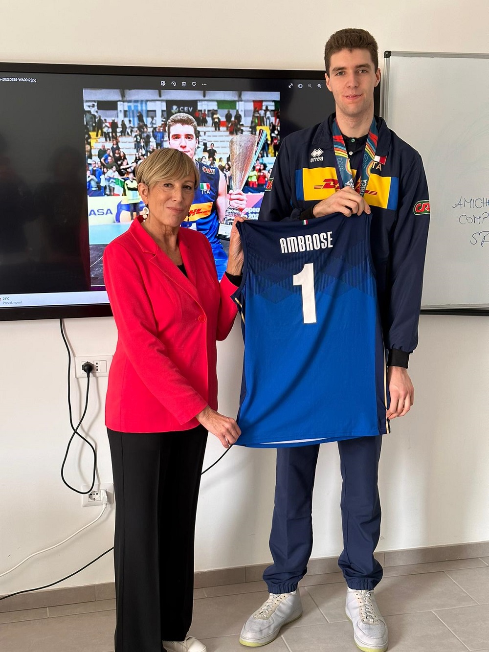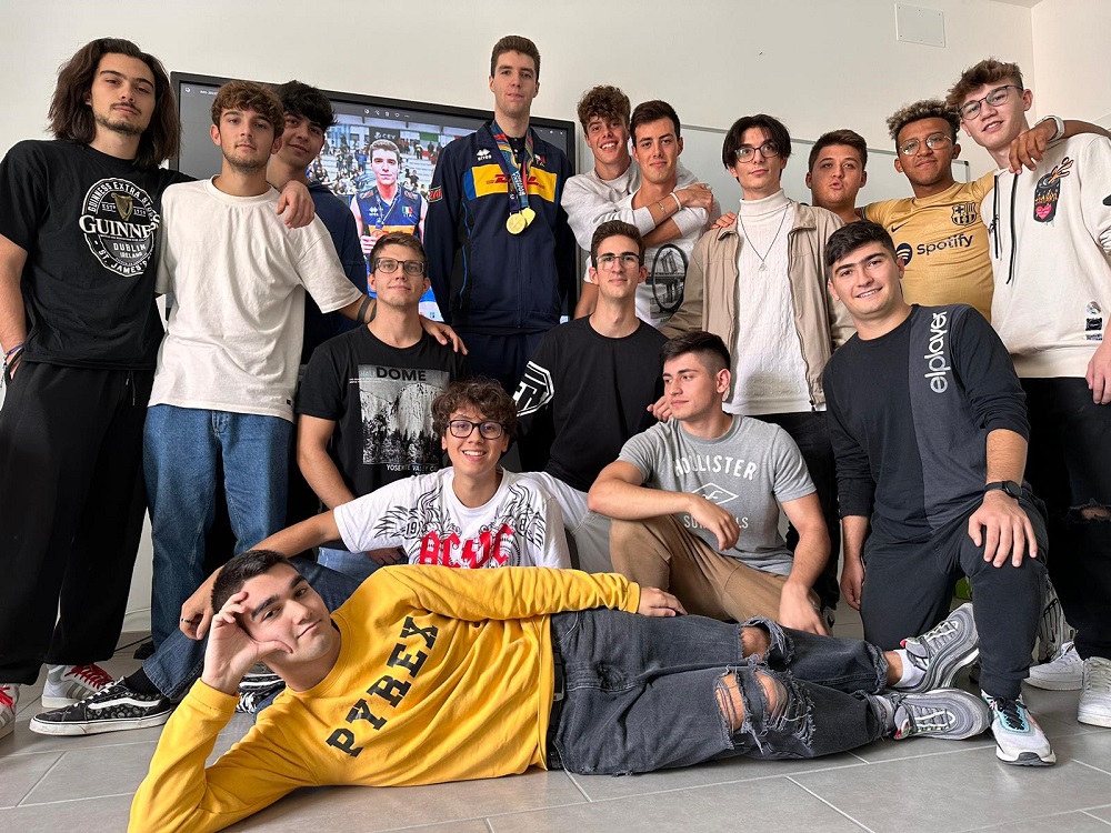 Con la modestia che lo contraddistingue, ma con un giusto orgoglio, lo studente ha mostrato ai compagni di classe le medaglie conquistate e li ha intrattenuti con una breve “lezione” sul volley.