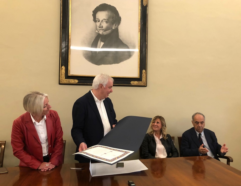 Sorti progressive ma non funeste, quasi a «smentire» il Poeta di riferimento, per la collaborazione tra Unimc e il Centro nazionale di studi leopardiani di Recanati. Rinnovata oggi pomeriggio – tra i presenti l’assessore comunale alla Cultura Rita Soccio e le consigliere del Cnsl la contessa Olimpia Leopardi, Rosanna Purchia e Fabiana Cacciapuoti – la convenzione tra l’Ateneo, guidato dal rettore Francesco Adornato, e il Cnsl guidato dal presidente Fabio Corvatta che ha il fine di gestire iniziative comuni volte a valorizzare la figura di Giacomo Leopardi. La prima collaborazione è datata 2011 quando era già stata stipulata tra i due enti una convenzione istitutiva della cattedra Giacomo Leopardi presso l’allora Facoltà di Lettere e Filosofia, nel 2017 la sottoscrizione di una convenzione più articolata. Ora il rinnovo di una convenzione che si pone numerosi e qualificati obiettivi.Ci sono tra i fini della collaborazione tra i due Enti l’attivazione di un modulo curricolare di lezioni dedicato all’approfondimento delle tematiche leopardiane, la collaborazione scientifica all’allestimento della Biblioteca digitale leopardiana, la definizione di progetti editoriali di rilievo nazionale e internazionale nell’ambito della tradizione dei testi, delle traduzioni e degli studi leopardiani, lo svolgimento di una funzione di raccordo tra il sistema bibliotecario dell’Ateneo di Macerata e la biblioteca del CNSL ai fini della catalogazione nell’Opac locale e nazionale dei materiali leopardiani, la validazione scientifica di iniziative organizzate in collaborazione dal Cnsl rivolte agli insegnanti ai fini dell’aggiornamento professionale, la realizzazione di iniziative di studio in collaborazione anche con altre istituzioni locali e centri di ricerca nazionali e internazionali, lo svolgimento di iniziative volte alla diffusione della ricerca leopardiana, nonché alle potenziali ricadute nel contesto sociale e culturale del territorio, la collaborazione alla realizzazione del Premio Giacomo Leopardi per Tesi di Dottorato e Tesi di laurea magistrale/specialistica, lo scambio di informazioni, documenti, pubblicazioni scientifiche e materiale bibliografico. Una serie di obiettivi di assoluto rilievo che sono sicuramente rivolti al futuro ma hanno un solido ancoraggio nel passato visto che da trenta anni, risale infatti al 20 gennaio del 1992 la legge 56, nota come Leopardi nel mondo voluta dall’ex ministro Franco Foschi, il Cnsl svolge un’attività di rilievo per la diffusione della figura di Leopardi nel mondo. Si parla oggi di internazionalizzazione, ma appunto c’è chi ha avuto una visione illuminata con alcuni decenni di anticipo rispetto a tanti altri. Dunque il tempo positivo dell’azione leopardiana si conferma il passato e il futuro, ma appunto le sorti sono progressive ma non nefaste, grazie anche all’azione di alcuni personaggi, in azione pro-tempore, per via della durata limitata degli incarichi, eppure determinanti nel lasciare il segno. Per questo ieri il Consiglio di amministrazione del Cnsl ha deliberato e consegnato ieri al rettore Francesco Adornato una pergamena con l’attestato di benemerenza, massimo riconoscimento previsto dallo statuto, per «l’elevato e generoso contributo con cui, in qualità di rettore dell’Università di Macerata, ha promosso la collaborazione tra l’Ateneo maceratese e il Centro Studi, attraverso la cattedra Giacomo Leopardi e gli importanti progetti condotti in sinergia, primo fra tutti la creazione di una biblioteca digitale leopardiana»