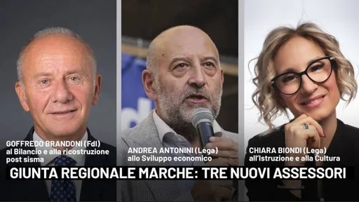 Sono Goffredo Brandoni (FdI) al Bilancio e alla ricostruzione post sisma, Andrea Antonini (Lega) allo Sviluppo economico e Chiara Biondi (Lega) all’Istruzione e alla Cultura; subentrano, rispettivamente, a Guido Castelli (Fdi), Mirco Carloni (Lega) e Giorgia Latini (Lega), eletti nel nuovo parlamento.