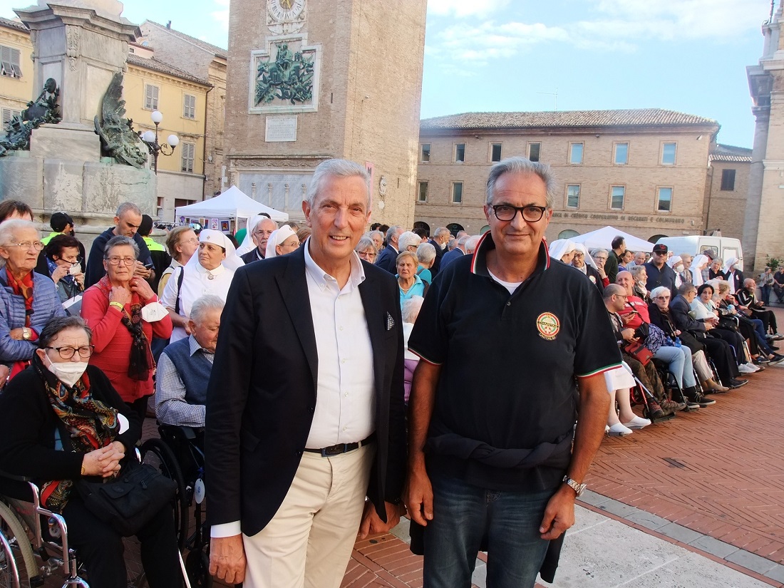 In Piazza Giacomo Leopardi, la folta comitiva è stata accolta dal Sindaco Antonio Bravi per un saluto di benvenuto, mentre il Presidente Regionale della Sezione Lombarda, Luciano Pivetti, ringraziando per la gentile accoglienza ed ospitalità, ha promesso di esser latore verso tutte le altre sezioni lombarde per mettere Recanati in tour, come tappa fissa, nei futuri pellegrinaggi a Loreto.