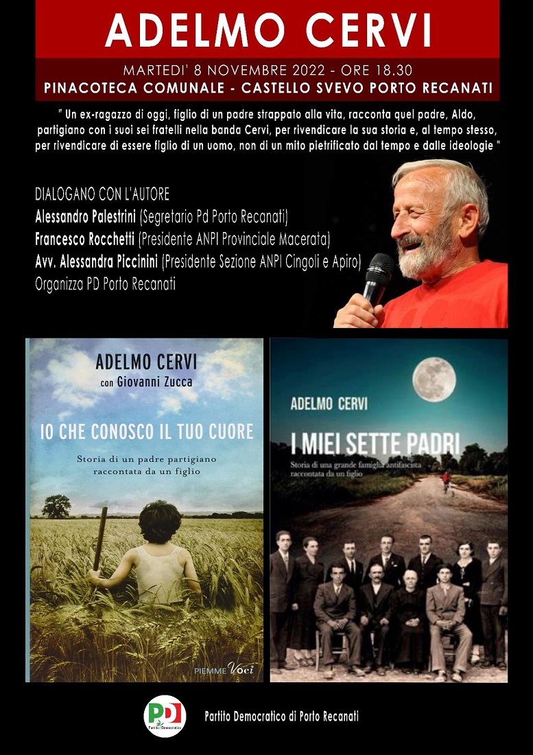 Siamo onorati di ospitare a Porto Recanti, Martedì 8 Novembre alle ore 18:30 presso la Pinacoteca del Castello Svevo, Adelmo Cervi, figlio di Aldo.