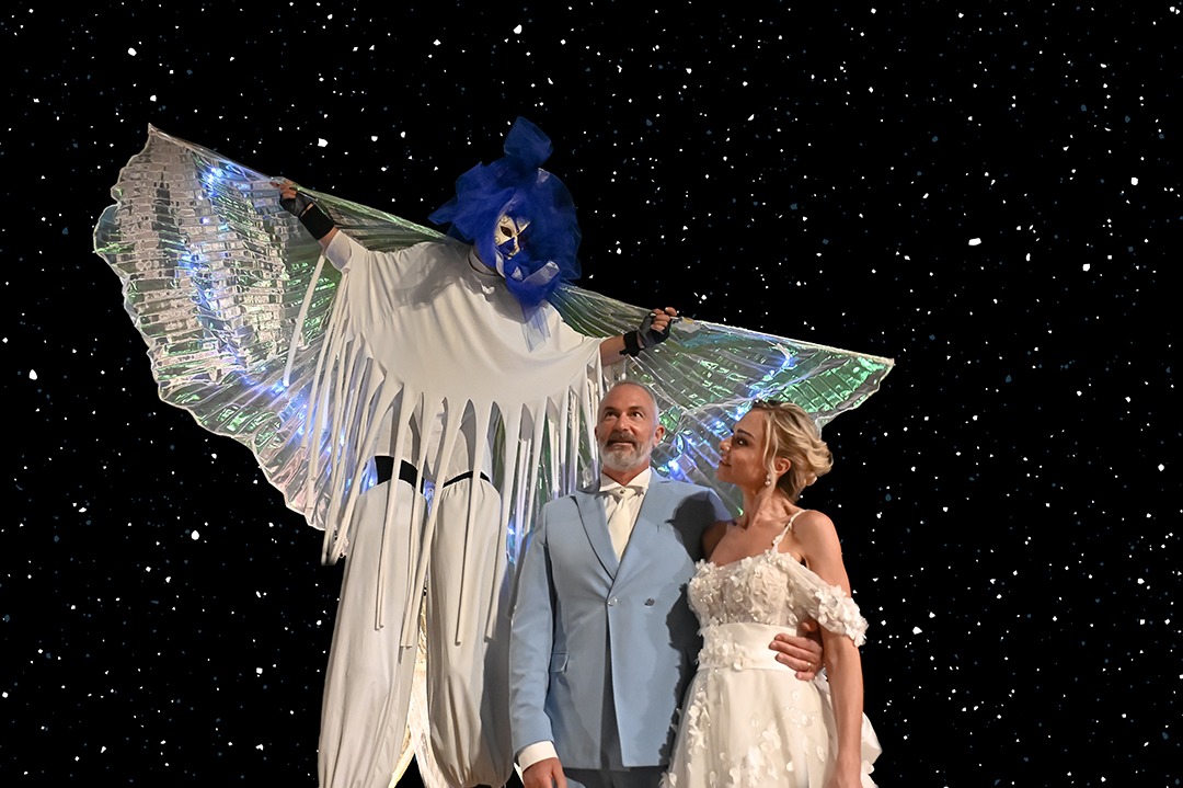 Non sono mancate le soprese con il mangiafuoco e la magia dei trampoli con ali di led degli artisti di Oriana Simonetti anch’essa Marchigiana.
