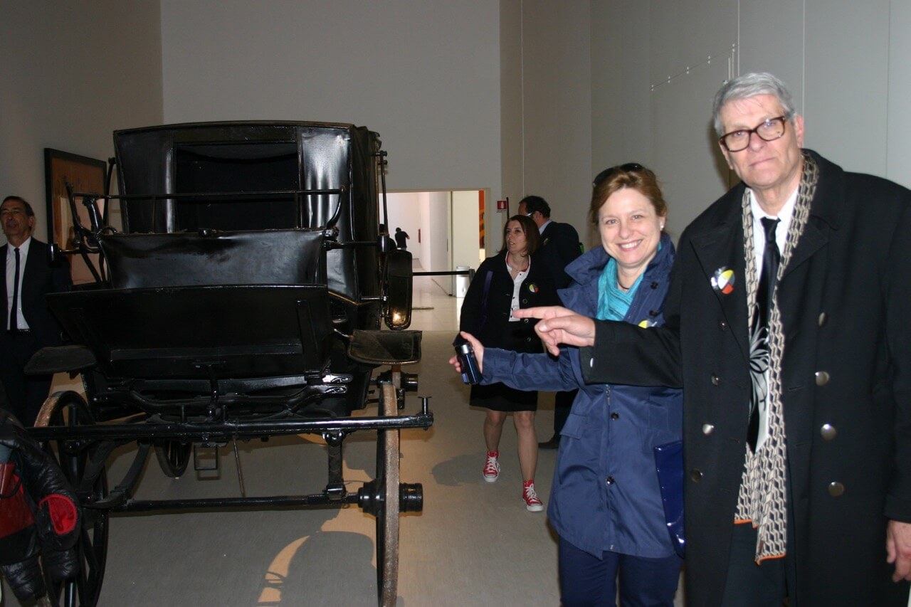 Pio Monti e Nikla Cingolani vicino all’opera di Gino De Dominicis Mozzarella in carrozza, 1970 durante la mostra “ARTS & FOODS. RITUALI DAL 1851″, EXPO Milano 2015