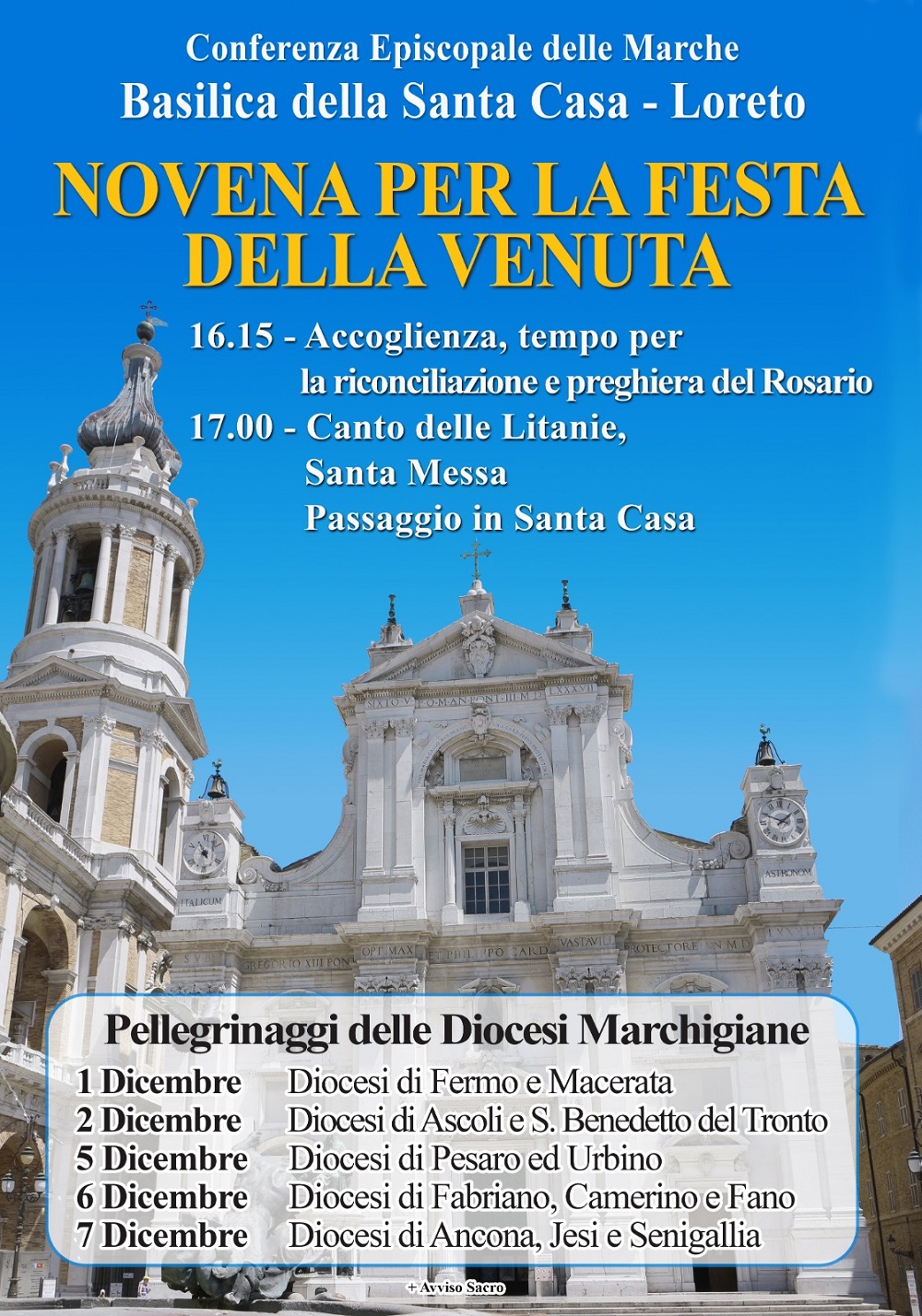 La Delegazione Pontificia è lieta di informare che in occasione della Novena dell’Immacolata per la festa della Venuta, le celebrazioni si svolgeranno come da tradizione con la partecipazione quotidiana delle Diocesi delle Marche. Tale appuntamento è occasione di preparazione alla Festa dell’Immacolata, alla successiva Festa della Venuta, alla celebrazione della B.V. M. di Loreto del 10 dicembre.
