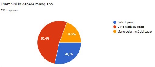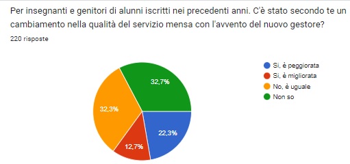 E’ naturale, quindi, immaginare per i nostri bambini un servizio che riceva consensi positivi piuttosto che tiepidi giudizi o persino rassegnazione ad una mensa scadente. In definitiva, appare evidente che parte della comunità non è soddisfatta del servizio erogato e che auspica una maggiore sensibilità, interesse ed attenzione nella predisposizione del prossimo bando. Per questo, nei prossimi mesi la Commissione Mensa presenterà all’Amministrazione Comunale le proprie osservazioni e richieste.