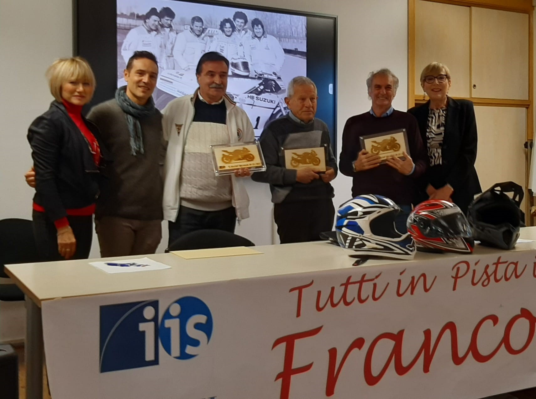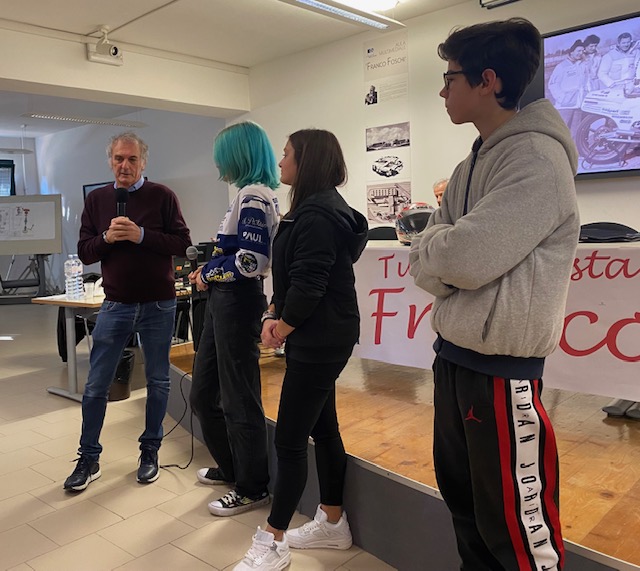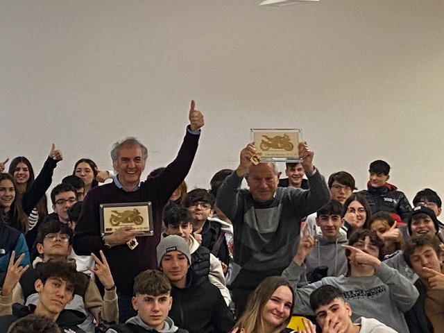 L’incontro è stato anche l’occasione per festeggiare i 40 anni della vittoria al Mondiale con la consegna da parte del Dirigente Scolastico, Prof.ssa Antonella Marcatili, di una targa realizzata dagli studenti al campione Franco Uncini, al meccanico Mario Ciamberlini ed al Responsabile del Moto Club “Franco Uncini”, Franco Frontini, degna conclusione di una mattina davvero emozionante