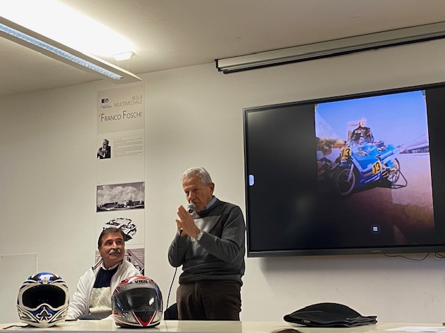 L’incontro, coordinato dalla Prof.ssa Franca Maggini, si è aperto con la proiezione di un breve video dedicato a Franco Uncini, realizzato dal prof. Riccardo De Angelis, seguito dalla presentazione della carriera del campione attraverso una serie di slide preparate da uno studente.