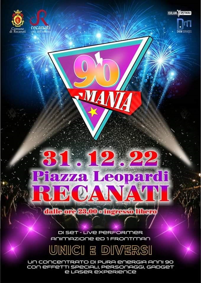 Dalle 23 poi piazza Leopardi si veste a festa con un concentrato di pura energia anni ’90 con effetti speciali, personaggi, gadget e laser experience. Sul palco il dj set – live performer, l’animazione e un frontman.