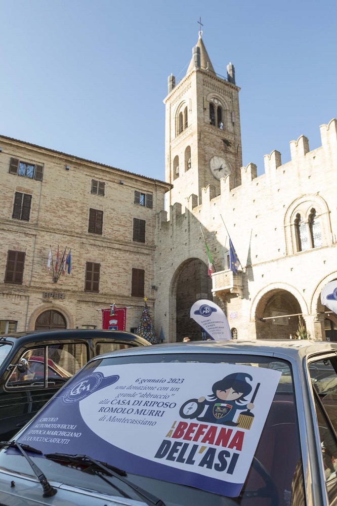 Nel programma nazionale “La Befana dell’ASI”, consiglieri e soci del CAEM/Lodovico Scarfiotti si sono dati appuntamento a Montecassiano, per partecipare alla giornata nazionale solidale con una donazione per la Casa di Riposo comunale Romolo Murri. Nella suggestiva cornice della centrale Piazza Unità d’Italia davanti al bellissimo cinquecentesco Palazzo dei Priori, simbolo storico della cittadina riconosciuta tra “I Borghi più belli d’Italia”, è stata il vicesindaco Katia Acciarresi ad accogliere le auto d’epoca ed i rappresentanti del sodalizio guidati dal presidente Roberto Carlorosi.