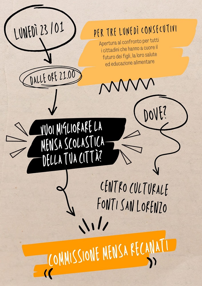 La commissione mensa, nell’impegno profuso per migliorare il servizio, chiede sostegno ai cittadini recanatesi. In una sorta di sussidiarietà, in questo primo momento, orizzontale considerando quanto la mensa – per l’utenza a cui si rivolge- è da considerare a tutti gli effetti un bene comune per il quale la cittadinanza è chiamata ad interessarsi, abbiamo deciso di organizzare delle consultazioni pubbliche in vista del nuovo bando per la ristorazione scolastica.