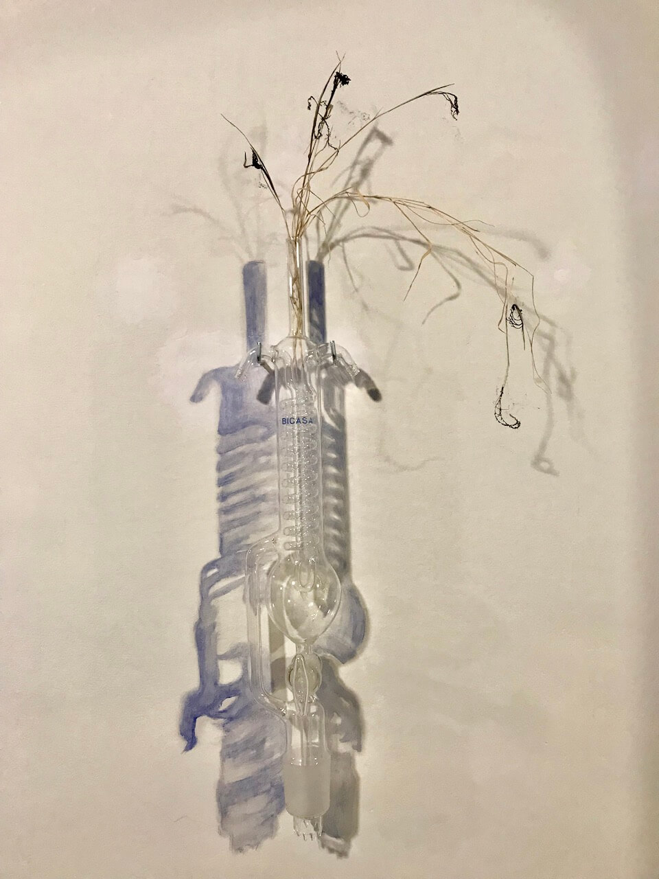 Se il filo conduttore che unisce il linguaggio delle tre artiste è l’importanza dell’azione, del gesto, di quel passo da compiere ogni volta per realizzare le loro opere e riflettere su quanto quei passaggi abbiano innescato un cambiamento, il vero elemento guida della mostra è l’Incontro, sintetizzato nell’opera omonima di Cingolani: un alambicco dalla forma antropomorfa, con l’ombra disegnata sulla parete, che accoglie fili di erba infestante. Il vaso alchemico, contenitore che sublima e libera energie pure, è simile allo spazio domestico, contenitore di presenze che, con le proprie luci ed ombre, sono coinvolte in un processo di trasformazione in costante evoluzione.