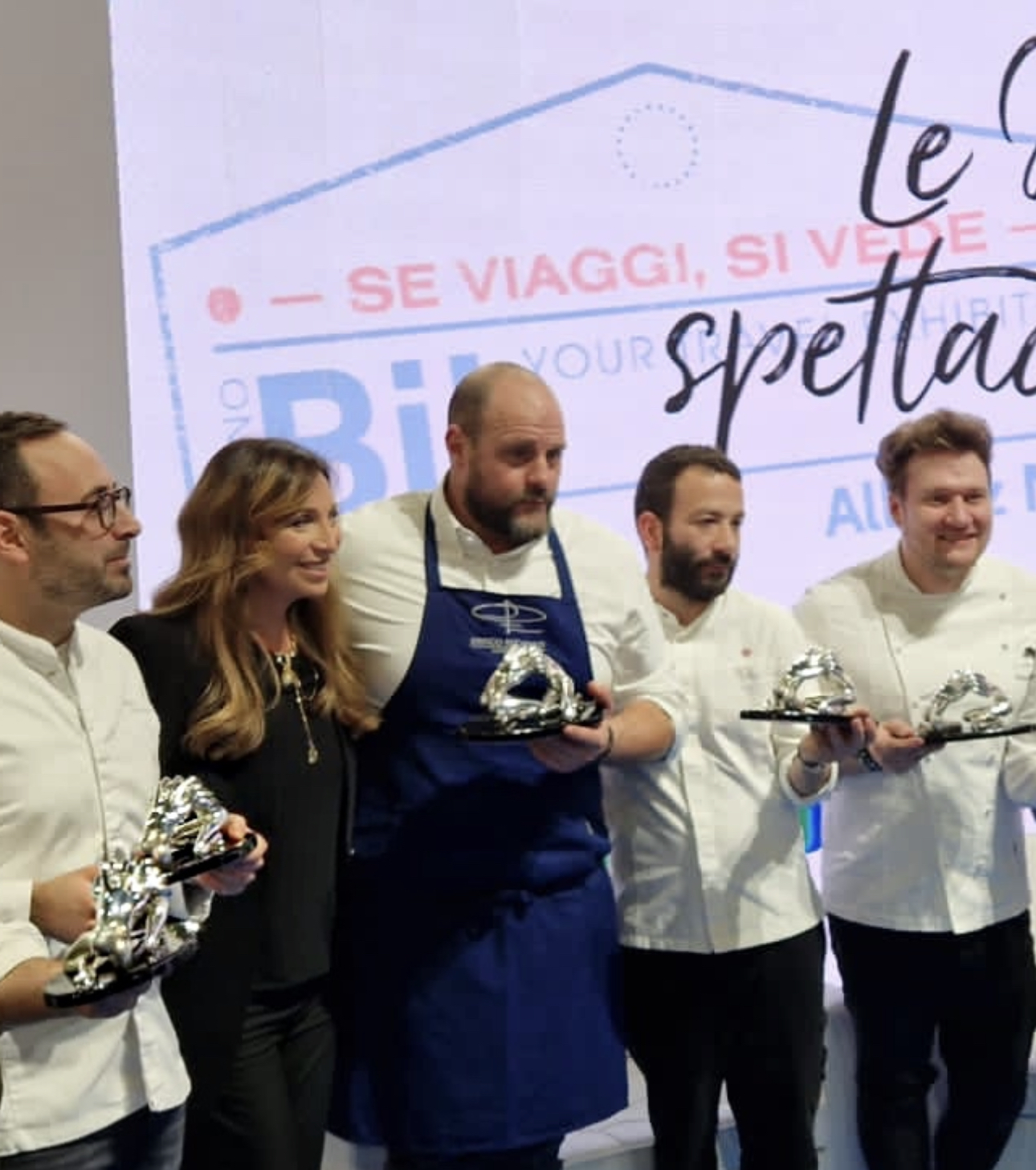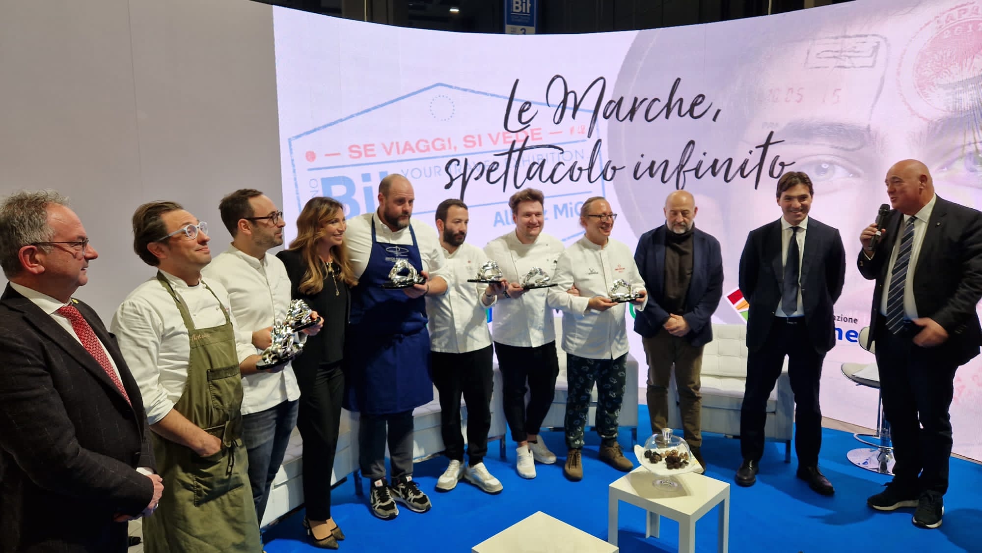 In occasione della Borsa Internazionale del Turismo di Milano, gli chef stellati marchigiani protagonisti allo show cooking nello stand della Regione Marche, sono premiati dal presidente della Regione Marche dott. Francesco Acquaroli, dal direttore dell’ Agenzia per il Turismo e l’Internazionalizzazione delle Marche dott. Marco Bruschini e dall’Amministratore Delegato dell’azienda Ottaviani S.p.A. arch. Laura Ottaviani.
