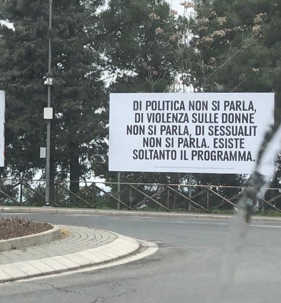 “Di politica non si parla, di violenza sulle donne non si parla, di sessualità non si parla. Esiste soltanto il programma”: è questo il maxi manifesto che capeggia da qualche giorno lungo la rotatoria che si trova sotto Villa Colloredo Mels, un punto importante per il traffico cittadino di Recanati. Ha suscitato, naturalmente, non pochi interrogativi e battute in città e in molti hanno pensato ad una forma di protesta di studenti nei confronti della scuola.