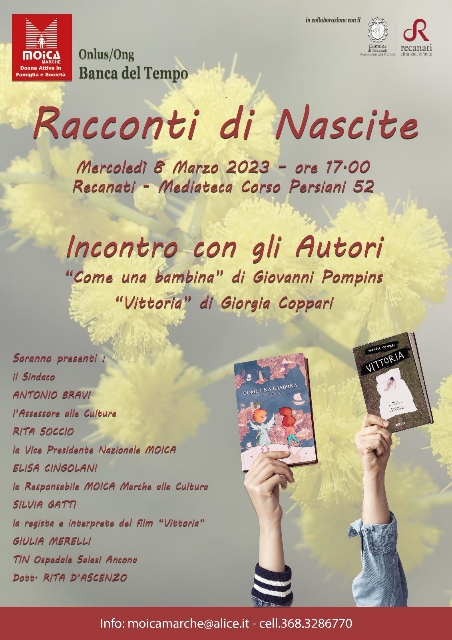 Mercoledì 8 marzo 2023 ore 17.00 evento MOICA Marche – Donne Attive in Famiglia e Società presso la Mediateca di Recanati per incontrare gli autori di racconti di nascite premature, Giorgia Coppari ” Vittoria ” e Giovanni Pompins ” Come una bambina”. Presenti anche la regista Giulia Merelli interprete del film ” Vittoria” e la Dott. Rita D’ Ascenzo TIN (Terapia Intensiva Neonatale) dell’Ospedale Salesi di Ancona.