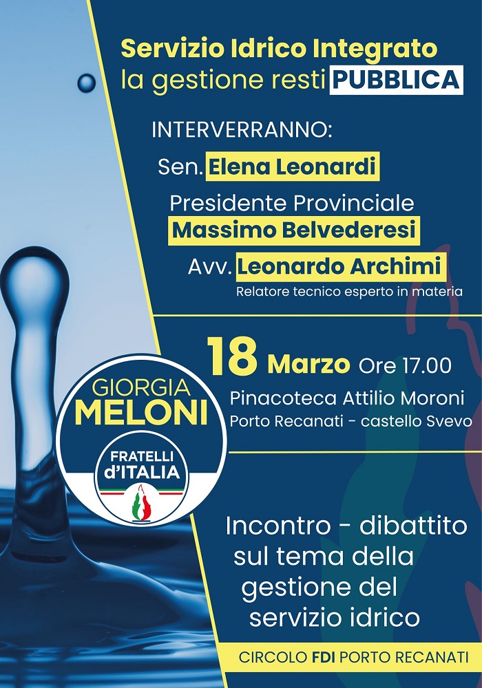 Il tema della gestione del servizio idrico in Provincia di Macerata, dove si dovrà presto procedere all’adeguamento alla normativa nazionale che prevede un’unica soluzione per tutto il territorio provinciale, è di stretta urgenza. Fratelli d’Italia sta proponendo una soluzione consortile, a livello provinciale, affinché le sei attuali aziende idriche giungano a un’unica realtà di natura pubblica, tutelando i cittadini e mantenendo agevoli le tariffe.