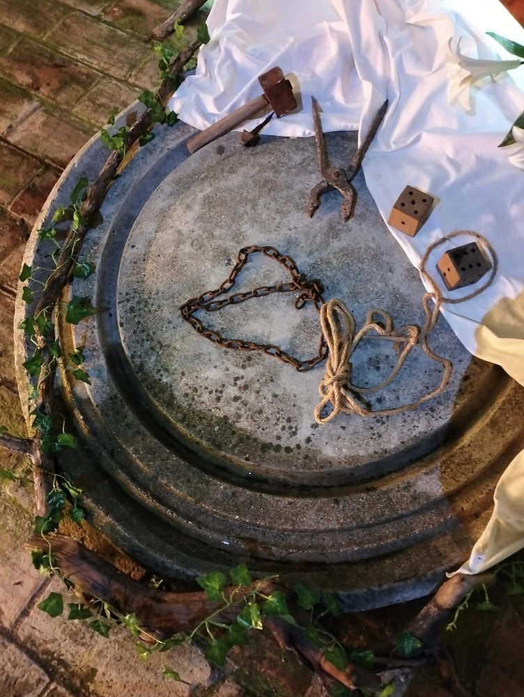 Il posto di guardia ci dice come il Bene vinca sul Male e come la Luce e la Croce rompano le tenebre. Alle spalle del tronco d’albero ci sono le croci dei ladroni che indicano il Male, mentre lo stesso tronco posto in primo piano, a terra, e la croce illuminata con accanto l’edera, che vuole richiamare anche la vite e la Vita, e il giglio, col telo bianco, rappresentano la vittoria del Bene, la Purezza, la Rinascita. Coi rami, da quelli secchi a quelli fioriti, si vuole indicare il passaggio alla Vita ed alla Primavera. Non possono inoltre mancare i tradizionali attrezzi che hanno contraddistinto la Passione di Nostro Signore.