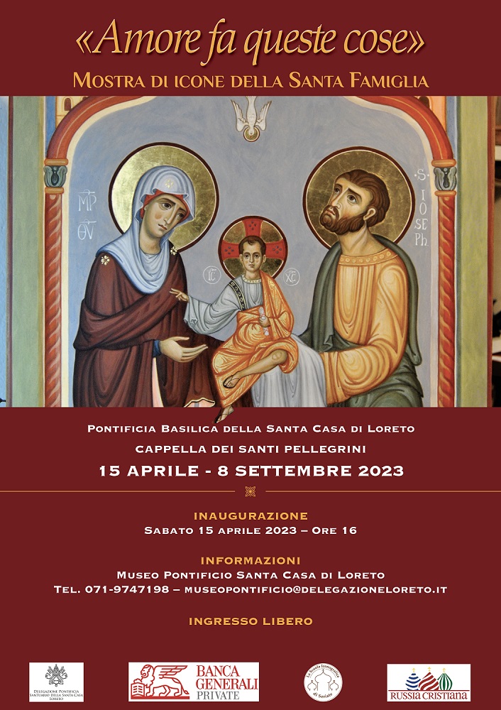 La Delegazione Pontificia è lieta di annunciare che sabato 15 aprile alle ore 16.00 sarà inaugurata e aperta al pubblico presso la Cappella dei Santi Pellegrini la mostra dal titolo “Amore fa queste cose”, proposte per un’iconografia della Santa Famiglia, a cura della Scuola Iconografica di Seriate in collaborazione con il Museo Pontificio Santa Casa e la Fondazione Russia Cristiana e con il contributo di Banca Generali Private.