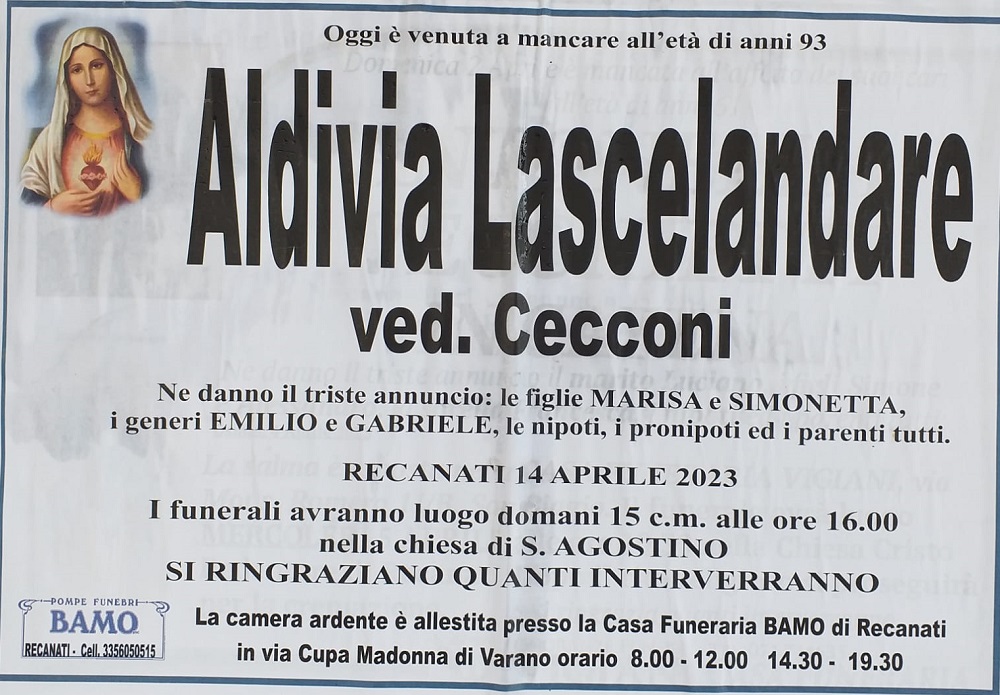 E’ morta Aldivia Lascelandare ved. Cecconi