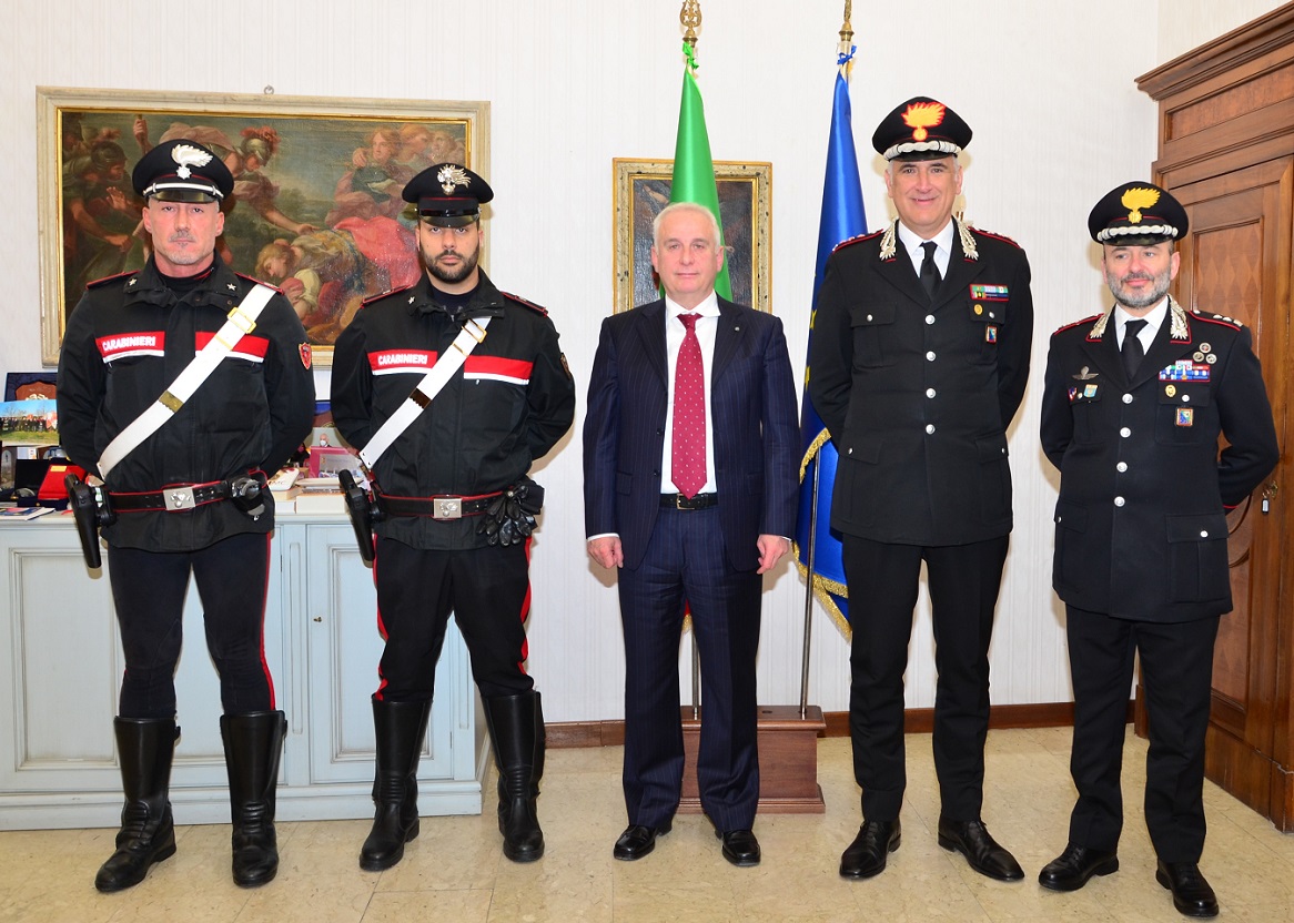 I due militari sono stati accompagnati in mattinata dal comandante provinciale, col. Nicola Candido, e dal comandante della compagnia, ten. col. Giorgio Picchiotti, in Prefettura dove il Prefetto Flavio Ferdani ha espresso tutto il suo compiacimento per l’intervento effettuato lo scorso 8 aprile in favore di una persona in un momento di difficoltà.