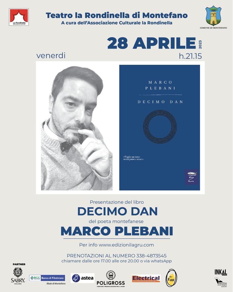 I partecipanti al Corso di Dizione dell’Associazione Culturale La Rondinella, tenuto dal Maestro Piergiorgio Pietroni, durante la presentazione del libro DECIMO DAN di Marco Plebani leggeranno interpretando le poesie dello scrittore montefanese. Un piccolo omaggio che i montefanesi faranno all’estro creativo di un loro concittadino.