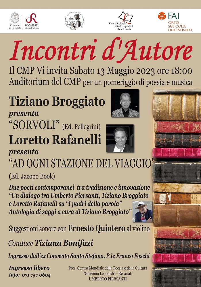 I Poeti Tiziano Broggiato e Loretto Rafanelli presenteranno le loro opere e dialogheranno con il Prof. Umberto Piersanti. Interventi musicali con Ernesto Quintero al violino.