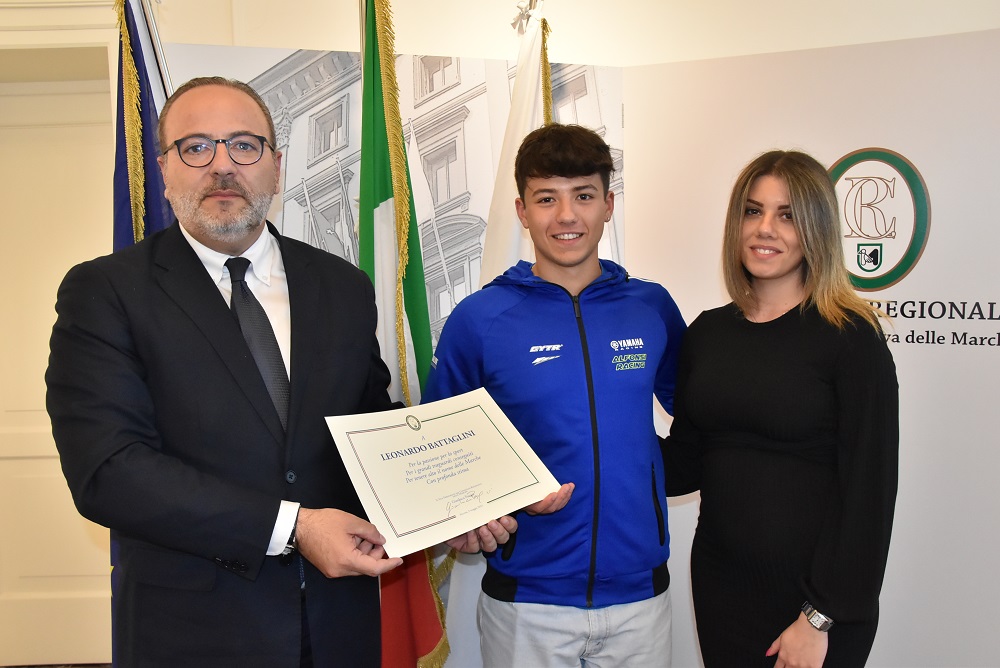 Encomio dell’Assemblea legislativa delle Marche attribuito a Leonardo Battaglini per i suoi importanti traguardi sportivi. A consegnarlo nelle mani del giovane motociclista, attualmente tesserato per il Team Alfonsi Racing di Firenze ed originario di Recanati, è stato il Vicepresidente del Consiglio, Gianluca Pasqui. “Leonardo è una giovane promessa dello sport che onora la maglia della grande comunità marchigiana. Il suo impegno ed i suoi successi presenti e futuri – ha aggiunto Pasqui – servono anche a mantenere alta l’attenzione su quella parte della ricostruzione post terremoto che riguarda il tessuto sociale dell’entroterra”.