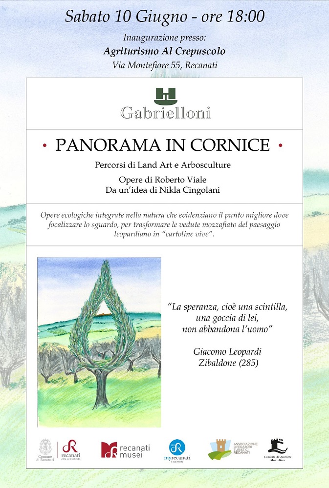 A Recanati sabato 10 giugno 2023 alle ore 18 prende il via presso l’Agriturirmo Al Crepuscolo di Montefiore il progetto PANORAMA IN CORNICE – Percorsi di Land Art e Arbosculture. Nato da un’idea di Nikla Cingolani per contrastare la possibile costruzione di una discarica nel paesaggio che ha ispirato Giacomo Leopardi, è stato elaborato e definito dall’eco-artista Roberto Viale con la proposta di opere ecologiche integrate nella natura che evidenziano un punto dove focalizzare lo sguardo per trasformare le vedute in “cartoline vive”. Il progetto mira a generare nuove visioni per un futuro incentrato nello spirito del green design in un’ottica ecologica. Per Recanati si tratta di un progetto pioneristico e senza precedenti che trova nel territorio il luogo ideale per la sperimentazione eco-artistica con azioni di cura del paesaggio. Per l’artista, l’intervento diretto nell’ambiente naturale, risponde alla propria coscienza etica nell’incessante ricerca di equilibrio tra la bellezza della natura e il gusto estetico. Nella città leopardiana, luogo per eccellenza dell’immaginazione, l’Arboscultura offre la possibilità di spaziare con la fantasia in un contesto paesaggistico unico per bellezza, cultura e poesia. Una cosa è certa: le Arbosculture non avvengono dall’oggi al domani. Il design è particolarmente legato ai ritmi della natura, perciò l’esito arriva dopo anni. Nel frattempo ci saranno occasioni per tornare sul posto e seguire la crescita della pianta fino a quando, tra qualche anno, si potrà godere del risultato; quindi, bisogna armarsi di pazienza, “la più eroica delle virtù” diceva Leopardi.