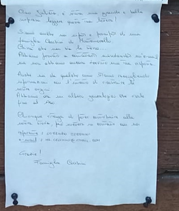 Appello che non è caduto nel vuoto perché sotto al suo foglio, scritto a mano con una penna biro, è stata affissa una seconda lettera, questa volta a firma di possibili parenti che vivono a Recanati. “Cara Julietta, è stata una grande e bella sorpresa leggere questa tua lettera! Siamo anche noi nipoti e pronipoti di una famiglia Cecchini di Montemorello. Chissà che non sia la stessa! Abbiamo provato a contattarti mandandoti una email, ma non abbiamo ancora ricevuto una tua risposta. Anche noi, da qualche anno, stiamo raccogliendo informazioni con l’intento di ricostruire le nostre origini. Abbiamo ora un albero genealogico che risale fino al 1900. Chiunque ritenga di poter contribuire alla nostra storia, può mettersi in contatto con noi: referente: Lorenzo Cecchini, mr.cecchini@gmail.com. Grazie, famiglia Cecchini”.