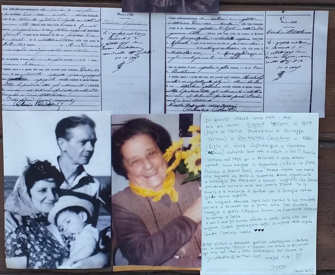 La ragazza è rimasta solo due giorni nella cittadina leopardiana e in questo breve soggiorno è andata a visitare il quartiere di Montemorello, ma non tanto per visitare la dimora del poeta Giacomo, quanto per ricercare le sue radici ed ha scoperto che proprio in via Montemorello sono nati e vissuti per diversi anni Virginia e Bartolomeo, sposati nel 1905 e subito dopo emigrati in Argentina (città di La Plata, provincia di Buenos Aires) “dove hanno iniziato una nuova vita segnata da senso di avventura, nuove opportunità e nostalgia per Recanati e Ancona. Sappiamo – scrive ancora Julietta – che hanno desiderato tornare nella loro amata Italia, ma la povertà e la mancanza di contatti con la famiglia nativa glielo hanno impedito”.