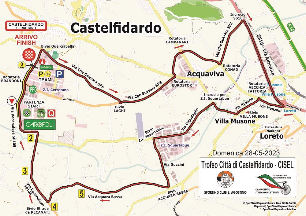 La seconda gara, ideale per velocisti, si svolge su un circuito pianeggiante di km. 22,800 da ripetere 8 volte su ampie carreggiate con numerose rotatorie. Si snoderà, oltre che a Castelfidardo, sui territori anche di Loreto e Recanati per un totale di km 182,400. Partenza alle ore 13:00. Arrivo previsto alle 17:00. Prima del via i corridori osserveranno un minuto di raccoglimento per ricordare il quarantunenne Stefano Martolini, giovane direttore sportivo della Viris Vigevano, che lo scorso anno, su queste strade, perdeva tragicamente la vita.