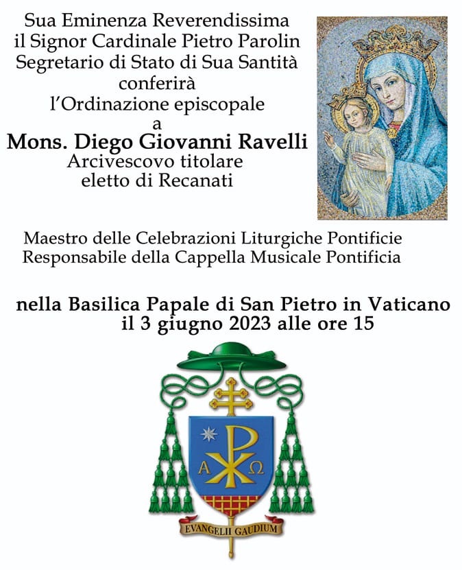 Si terrà sabato 3 giugno alle ore 15, nella Basilica Papale di San Pietro in Vaticano l’ordinazione episcopale di Monsignor Diego Giovanni Ravelli, Maestro delle celebrazioni liturgiche pontificie e responsabile della Cappella Musicale Pontificia Sistina, come Arcivescovo titolare eletto di Recanati.