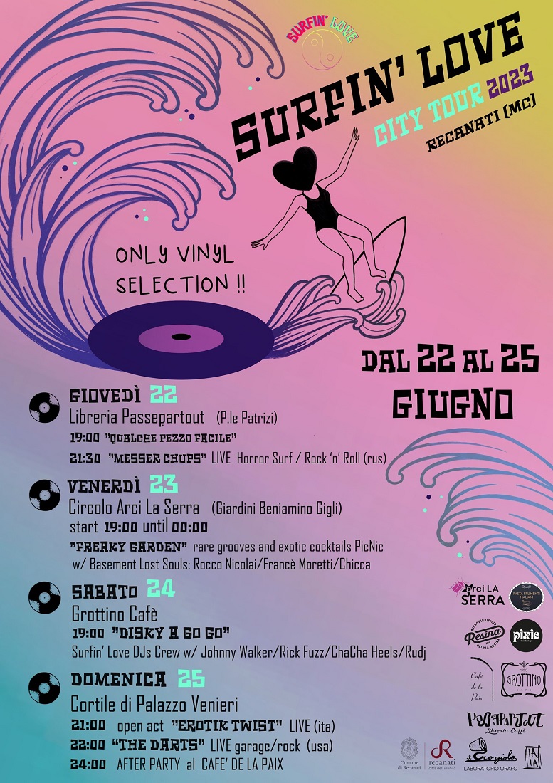 Sabato 24 dalle 19.00 al viale del Colle dell’Infinito, davanti al più poetico dei tramonti, “Disky à Go Go”, dj set della Surfin’ Love DJs Crew con Johnny Walker, Rick Fuzz, ChaCha Heel e qualcun altro a sorpresa.