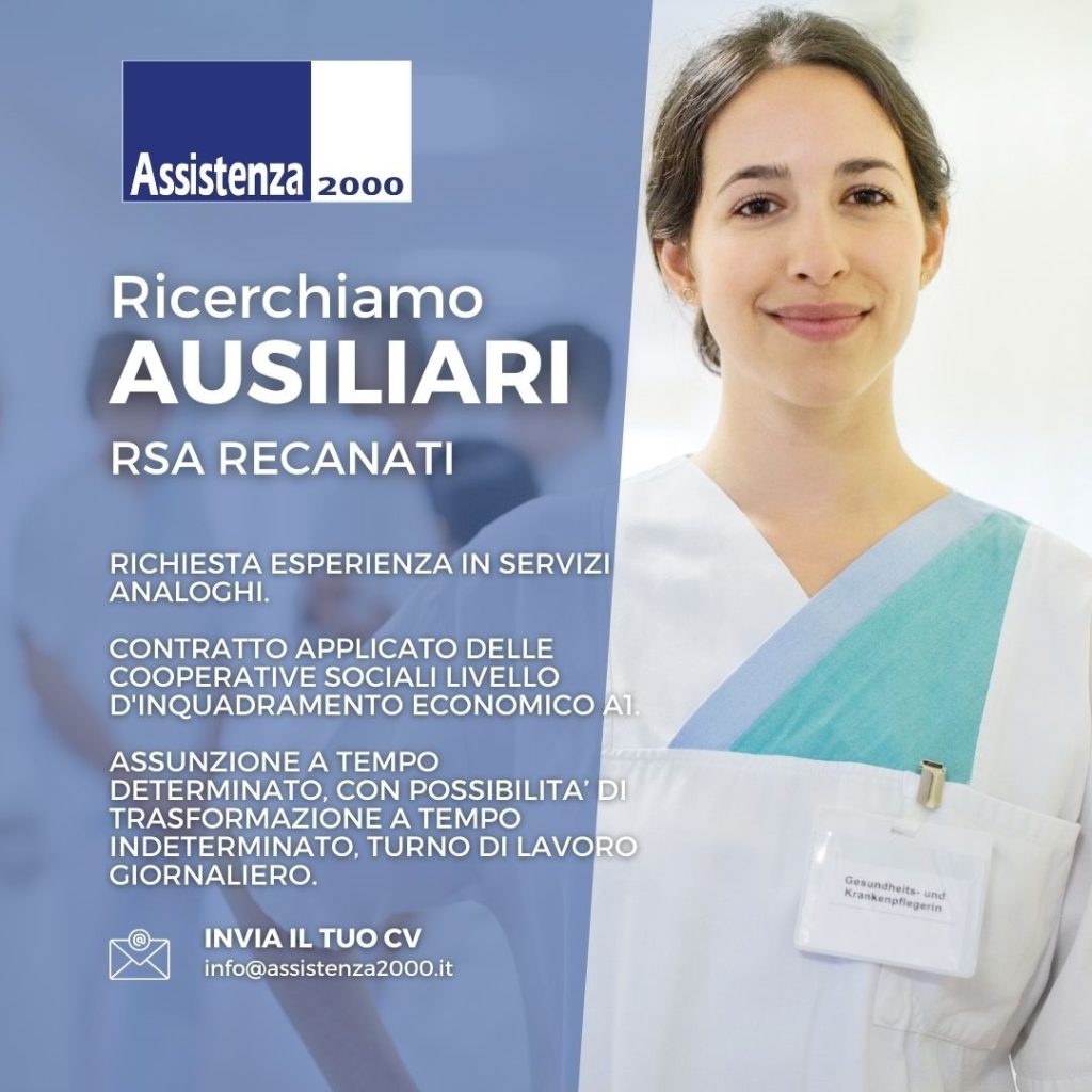 La Cooperativa sociale Assistenza 2000 con sede ad Ascoli Piceno seleziona ausiliari per RSA di Recanati di cui si è aggiudicata la gestione a partire dal 1° agosto. Chi è interessato può inviare la sua candidatura, completa di curriculum, all’indirizzo email: