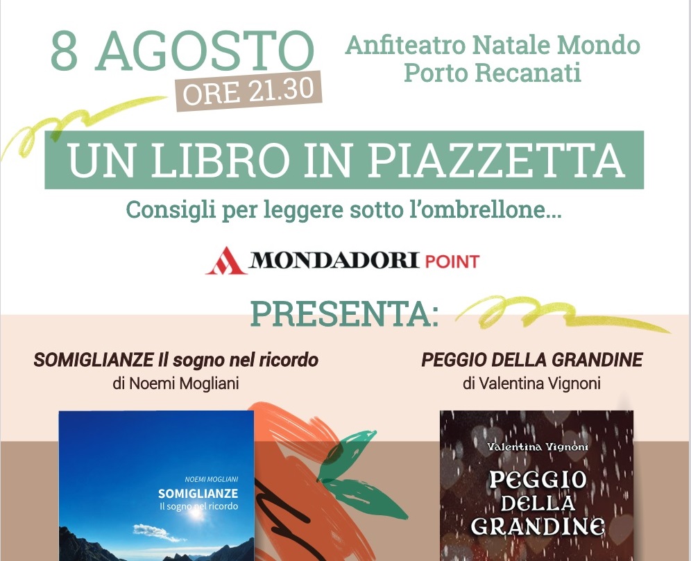 Il tanto caldo di questi giorni ha riacceso la necessità di rinfrescare la mente e quale modo migliore di un bel libro da leggere sotto l’ombrellone per combattere l’afa? Martedì 8 agosto, alle ore 21.30 all’Anfiteatro “Natale Mondo” di Porto Recanati, verranno presentati nel corso dell’evento “Un libro in piazzetta. Consigli per leggere sotto l’ombrellone” due romanzi di due scrittrici recanatesi, segno di un vivace ambiente culturale della città leopardiana. Interverranno Noemi Mogliani, autrice di “Somiglianze. Il sogno nel ricordo” e Valentina Vignoni con il suo “Peggio della grandine”.