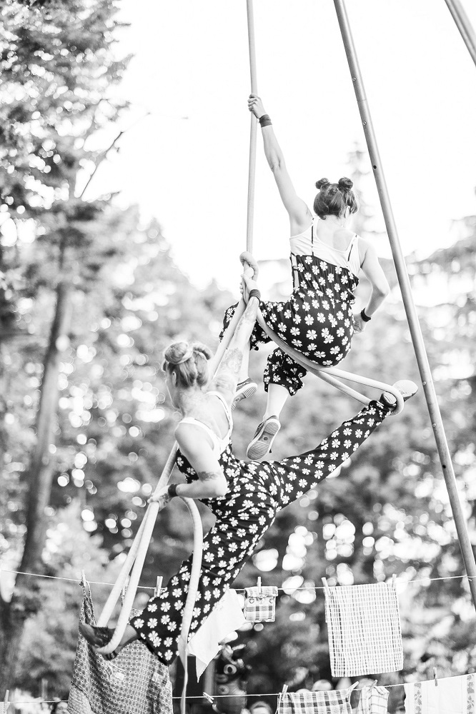 La loro passione per le discipline aeree le ha portate a creare “Resta” con cui hanno partecipato a festival d’arte di strada in tutta Italia, in Francia, Svizzera, Polonia e in Portorico.