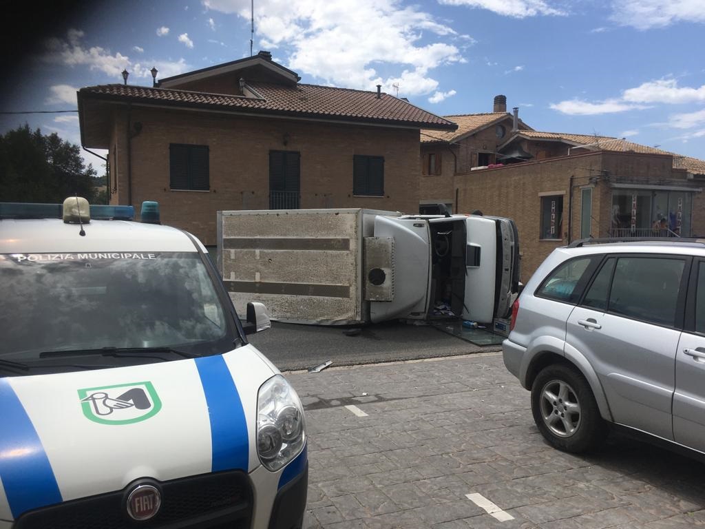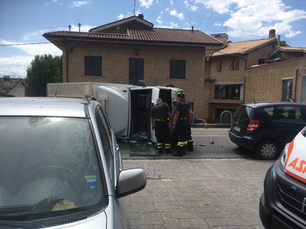 Incidente stradale oggi verso le 11,30 lungo la strada provinciale 77, in località Sambucheto, ai confini tra Recanati e Montecassiano, in pieno centro abitato. Coinvolti due auto e un furgoncino con cella frigorifera per il trasporto della carne che è finito rovesciato su un fianco in mezzo alla sede stradale.