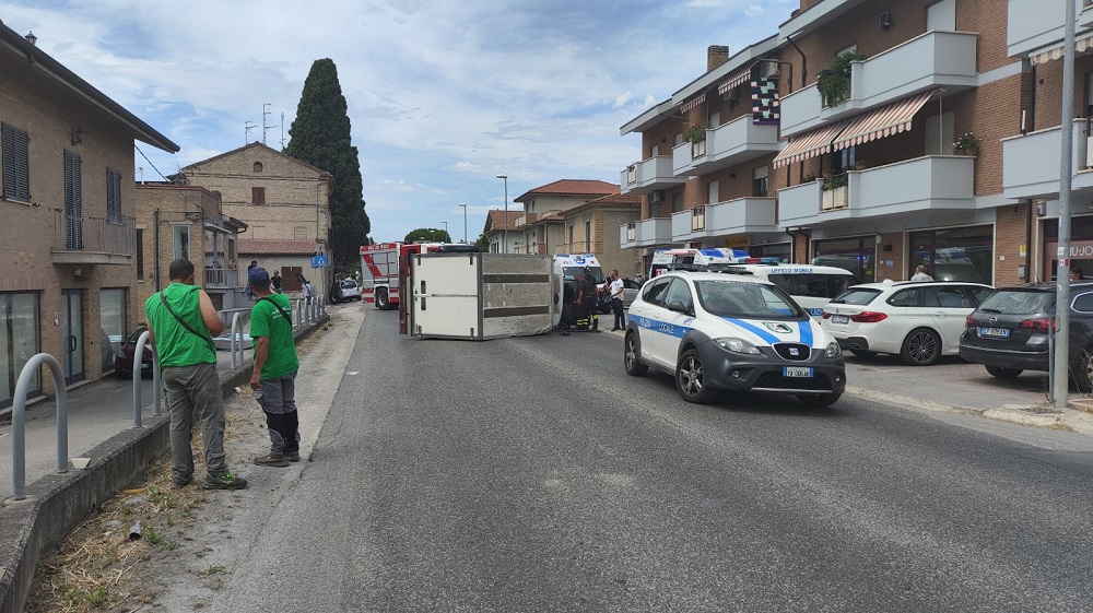 Sembra, comunque, che il furgoncino, per evitare un mezzo che procedeva in direzione opposta, abbia urtato due auto e un palo rovesciandosi poi su un fianco. Sul posto, oltre al 118, è intervenuta anche una squadra dei Vigili del Fuoco di Macerata per mettere in sicurezza l’area provvedendo anche a prelevare la batteria dal furgoncino per evitare possibili incendi.