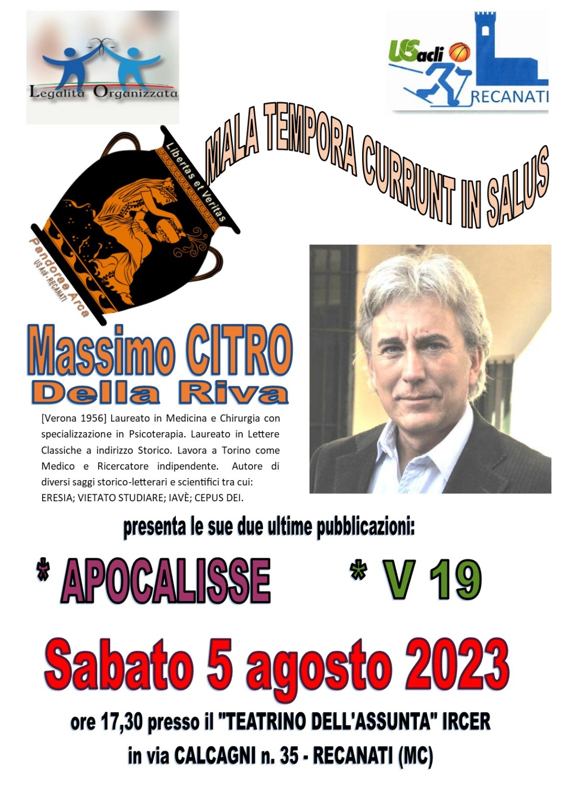 Le associazioni US ACLI Recanati e Legalità Organizzata, capitanate rispettivamente dai presidenti Barbara Benelli e Roberto Catani, ospiteranno a Recanati il prossimo sabato 5 agosto il dott. Massimo Citro Della Riva – laurea in medicina e chirurgia, nonchè laurea in lettere classiche a indirizzo storico, medico e ricercatore indipendente – autore di diversi saggi storico/letterari e scientifici.