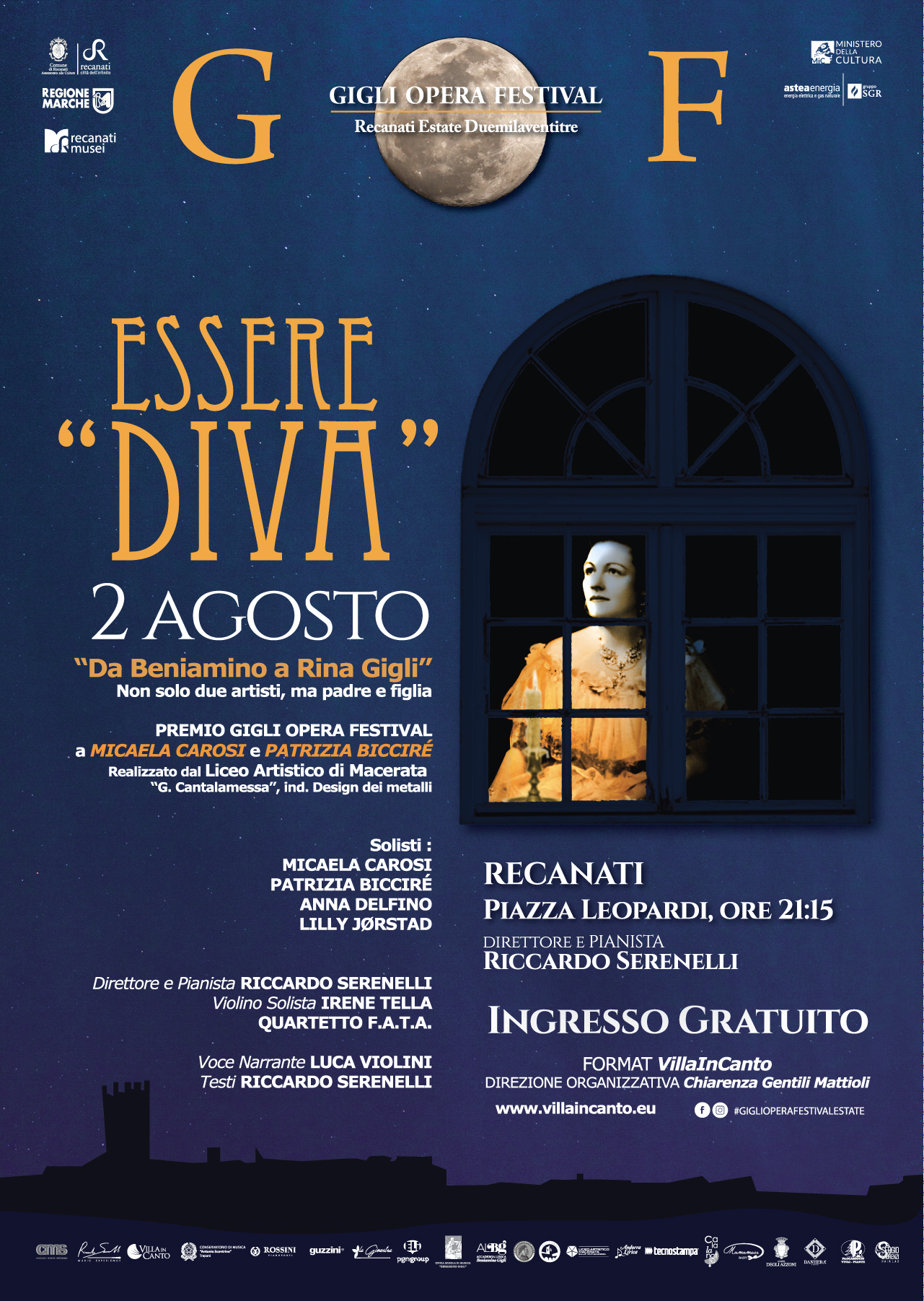 Grande è l’attesa per l’apertura del GOF, Gigli Opera Festival di Recanati, diretto dal Maestro Riccardo Serenelli, appuntamento giunto alla sua 14° edizione che mercoledì 2 agosto alle 21,15 vedrà sul palco di Piazza Leopardi una sfilata di grandi soliste per celebrare il soprano Rina Gigli, titolo della serata: “Essere ‘diva’ da Beniamino a Rina Gigli – non solo due artisti ma padre e figlia”
