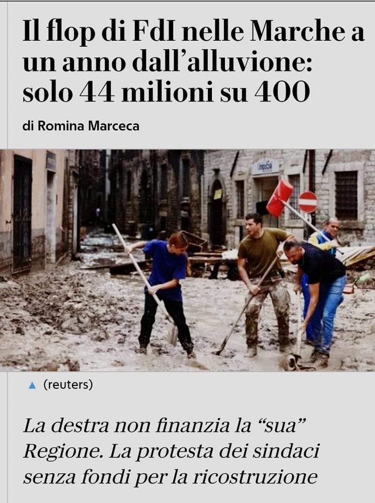 Oggi quel modello Marche da noi sempre contestato è sotto attacco anche dai Sindaci di centrodestra, sempre più numerosi nella nostra regione. Hanno abbozzato, hanno smussato, hanno inghiottito bocconi amari, ma alla fine sono esplosi. Dopo la propaganda delle prime ore della Meloni dinanzi alla tragedia vissuta dagli alluvionati, con le tante promesse fatte, oggi, ad un anno di distanza, i soldi non arrivano. Una vergogna senza precedenti.