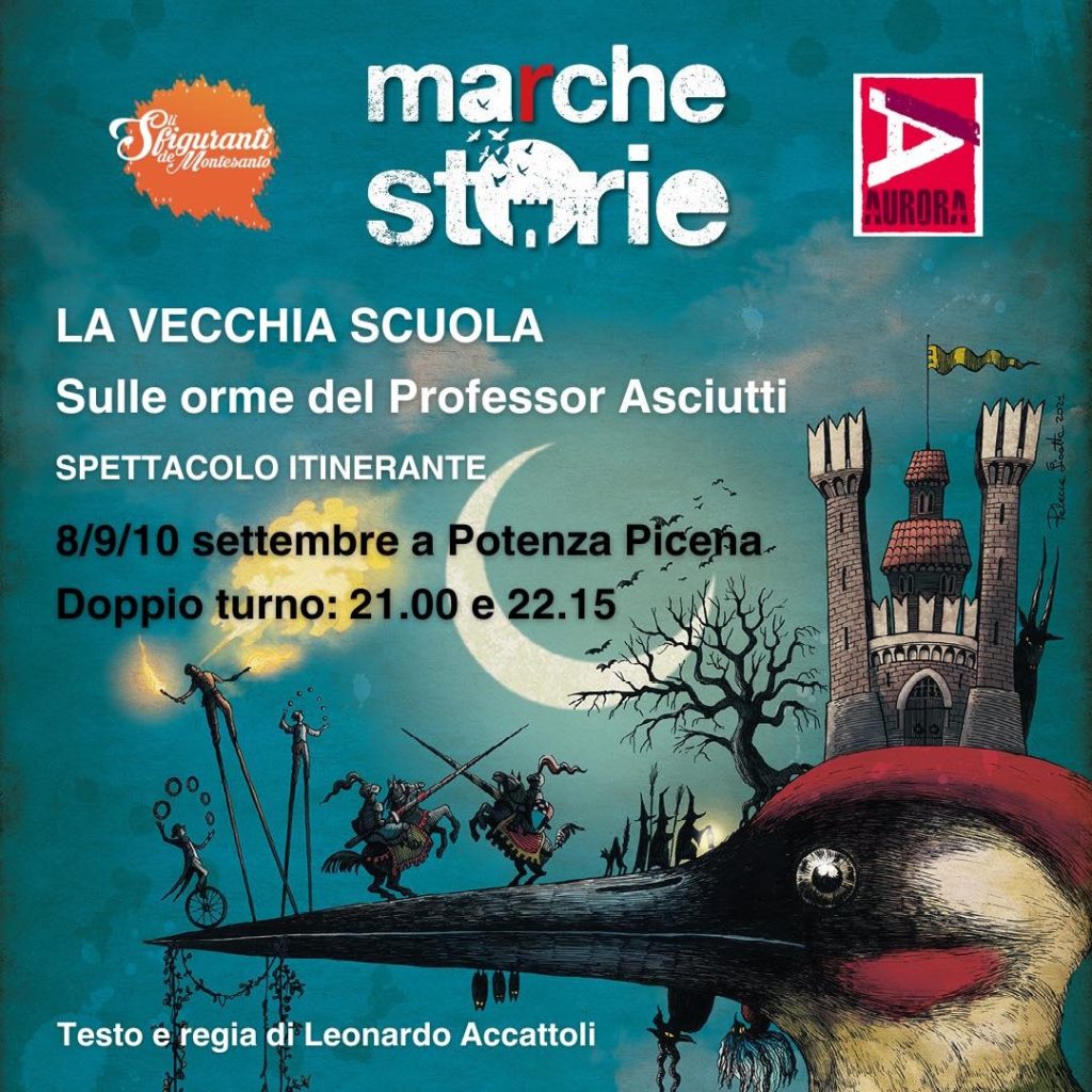 Protagonista dell’edizione 2023 a Potenza Picena è Giuseppe Asciutti: Professore e Direttore dell’antica e rinomata Scuola d’Arte applicata all’industria “Ambrogio della Robbia”. Si tratta di uno spettacolo itinerante che si dipanerà per le vie del borgo storico nei giorni di venerdì, sabato e domenica, interpretato dal duo comico “Li sfiguranti de Montesanto” con il sostegno dell’Associazione Aurora. “La Vecchia scuola – Sulle orme del Professor Asciutti” è il titolo dello spettacolo scritto e diretto da Leonardo Accattoli che si svolgerà ogni giorno in due turni: alle 21 e alle 22,15.