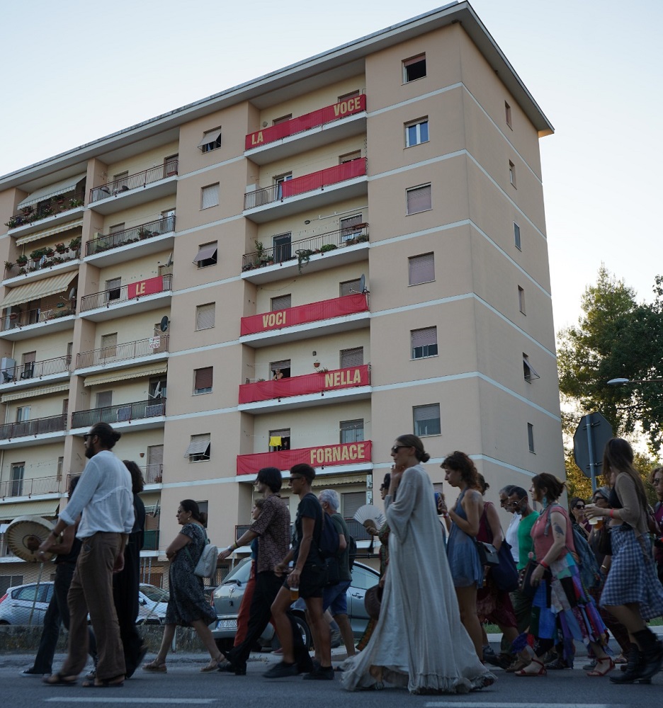 Appena terminata la conferenza siamo partiti in corteo e siamo arrivati dentro l’ex-fornace Smorlesi dove abbiamo vissuto tutti insieme il rito teatrale collettivo “L’Ufficio delle Tenebre” orchestrato da Giorgiomaria Cornelio. L’emozione di varcare un muro di recinzione che per tanti anni ci ha escluso, rivedere la folla rianimare quel luogo, come quando da fanciullo, proprio lì si svolgeva la festa della Madonna delle Rose (un momento, forse l’unico, di convivialità tra lavoratori e cittadinanza) mi ha fortemente commosso.