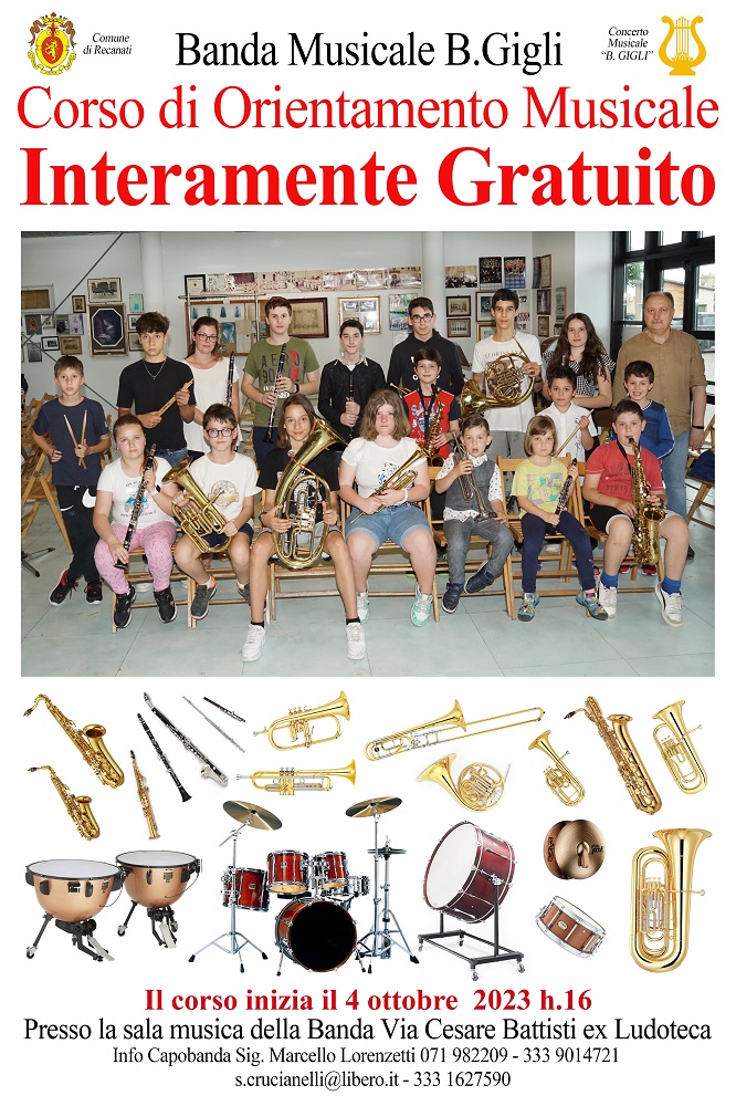 Al via a Recanati il Corso di Orientamento Musicale di tipo Bandistico per l’anno 2023-2024, organizzato dalla Banda musicale “B. Gigli”, che si svolgerà nella sala musica in via Cesare Battisti (ex ludoteca). Aperto a tutti, con preferenza bambini e ragazzi, il corso, organizzato con il contributo dell’Assessorato alle Culture del Comune di Recanati e della Regione, prevede lo studio di uno strumento a scelta tra le famiglie dei fiati e delle percussioni.