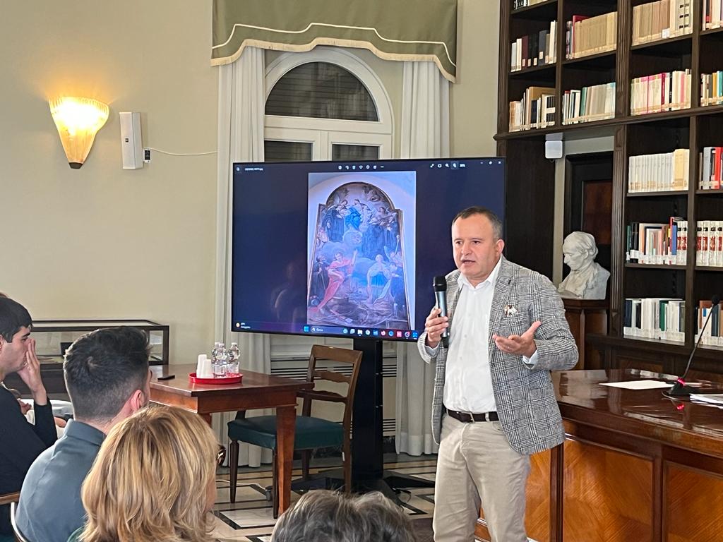 Il protagonista del secondo appuntamento, nella sala Foschi del Cnsl, è stato Andrea Marinelli che ha raccontato, suscitando l’attenzione della folta platea, come un’opera d’arte, senza firma e datazione come quella di “San Silvestro Guzzolini in atto di ricevere l’Eucarestia dala Vergine” custodita nella chiesa di San Vito,può essere un po’ svelata partendo dai volti e dai particolari visibili ad occhio nudo ed aggiungendovi anche l’aiuto delle tecnologie che fanno emergere anche la parte nascosta del dipinto. In videoconferenza il saluto di suor Barbara Brunalli che ha sottolineato l’importanza delle donazioni e l’impegno dell’Istituto per aprire la biblioteca alla città leopardiana, poi la relazione del presidente del Cnsl Fabio Corvatta: «E’ una biblioteca importante perchè sarà gestita dalle ragazze del Centro e perchè sarà aperta al pubblico».