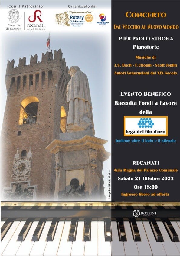 Tutta la cittadinanza è caldamente invitata a partecipare al concerto che si terrà il 21 ottobre 2023 alle ore 18:00 nell’Aula Magna del Comune di Recanati. Il maestro Pier Paolo Strona, al pianoforte porterà il pubblico DAL VECCHIO AL NUOVO MONDO sulle note di Bach, Chopin, Scott Joplin e vari autori venzuelani del XIX secolo.