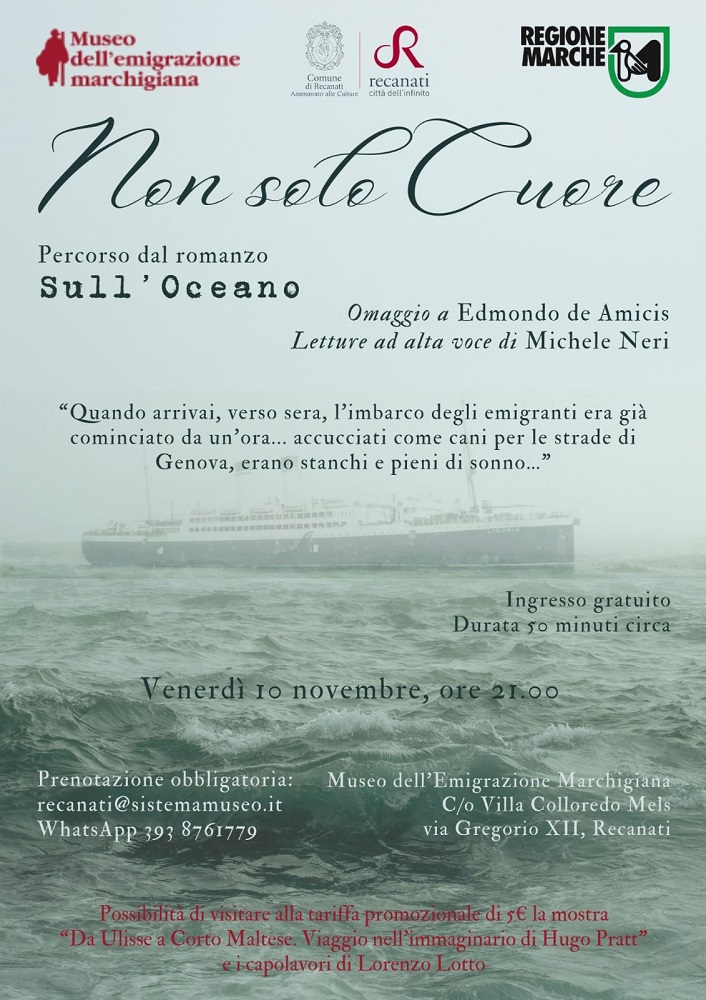 Si terrà venerdì 10 novembre, alle ore 21 presso il Museo dell’Emigrazione Marchigiana di Recanati, un percorso di letture ad alta voce a cura di Michele Neri partendo dal testo di Edmondo De Amicis “Sull’Oceano” del 1889, nel quale il celebre scrittore descrive con grande maestria il suo reale viaggio per le Americhe a bordo di un transatlantico. Per l’occasione De Amicis racconta con grande partecipazione la miseria e la tenacia del popolo dei migranti.