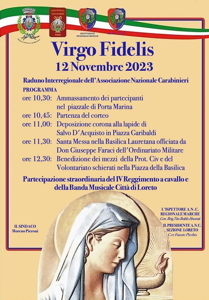 ‘Questa manifestazione è ormai entrata nella storia e nel cuore di Loreto – aggiunge il sindaco Moreno Pieroni – siamo davvero lieti ed orgogliosi che l’Associazione Nazionale Arma Carabinieri voglia ogni anno celebrare a Loreto la ricorrenza della Virgo Fidelis, anche per la profonda stima e riconoscenza per quanto fanno ogni giorno per il nostro Paese e per le nostre città’.